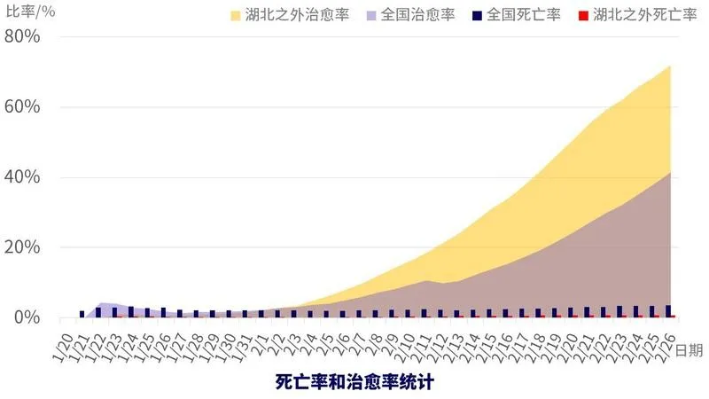 治愈率遠(yuǎn)超死亡率。截至2月26日,非湖北地區(qū)治愈率已達72%,死亡率為0.8%。全國治愈率也在不斷提升,與死亡率之間的距離快速拉大,2月26日,全國治愈率41.4%,死亡率3.5%。