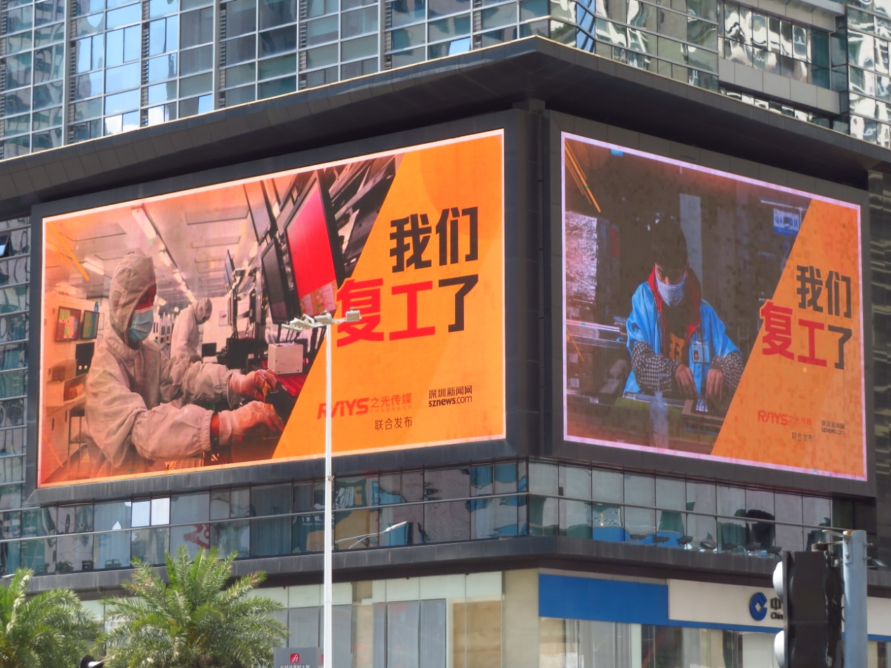 2月以來,深圳新聞網(wǎng)聯(lián)合之光傳媒在17塊戶外LED大屏廣告上刊登了多組不同主題的公益廣告,包括“加油中國”、“向逆行者致敬”、“瞞報就是犯罪”系列警示標語、“我們復(fù)工了”等。這些戶外大屏遍布全市各主干道和核心商圈,總面積達6000㎡,市場價值約1200萬元。