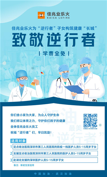 佳兆業(yè)文體集團(tuán)旗下的佳兆業(yè)樂火國(guó)際文體學(xué)校將于3月1日到12月31日為深圳抗疫醫(yī)護(hù)人員子女送免費(fèi)培訓(xùn)課程。