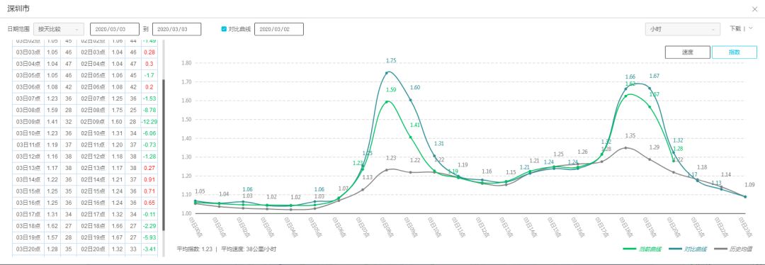 3日擁堵延時(shí)指數(shù)與2日和歷史均值對比
