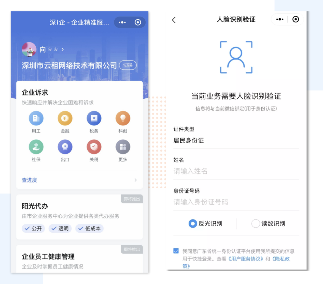 企業(yè)法人或經(jīng)辦人進(jìn)入“深i企-精準(zhǔn)服務(wù)服務(wù)”平臺(tái),選擇登錄,進(jìn)入實(shí)名認(rèn)證環(huán)節(jié)。輸入姓名和證件號(hào)碼后,通過(guò)人臉識(shí)別即可完成實(shí)名認(rèn)證。