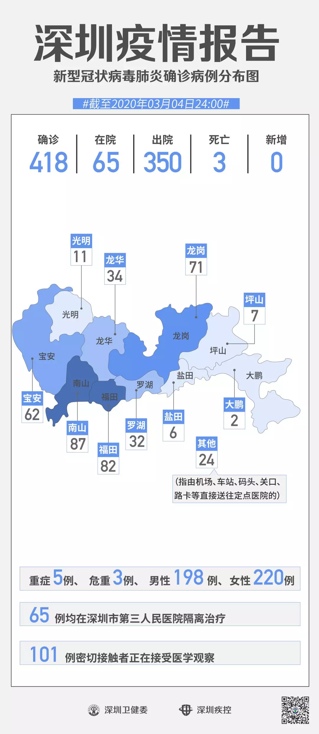 見圳客戶端·深圳新聞網(wǎng)2020年3月5日訊 截至3月4日24時(shí),深圳累計(jì)報(bào)告“新冠肺炎”確診病例418例。3月4日當(dāng)天全市無新增確診病例,當(dāng)天出院病例9例(從2月26日起不再公布出院個(gè)案)。