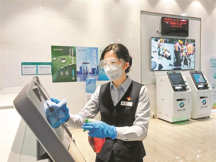 深圳水務(wù)集團福田分公司福田營業(yè)廳的楊麗娜,正對自動服務(wù)機進行消毒。