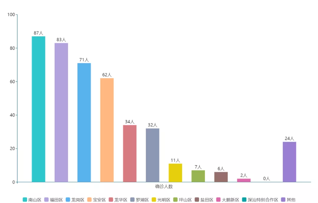 ▲按照區(qū)域劃分,已公布的確診病例中,南山區(qū)87例、福田區(qū)83例、龍崗區(qū)71例、寶安區(qū)62例,為患者較多的幾個(gè)區(qū),與其人口較多、經(jīng)濟(jì)發(fā)達(dá)有關(guān)。深汕特別合作區(qū)暫未出現(xiàn)病例。