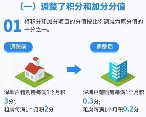(1)深圳戶籍購(gòu)房從每滿1個(gè)月積3分,調(diào)整為積0.3分;租房從每滿1個(gè)月積2分,調(diào)整為0.2分。