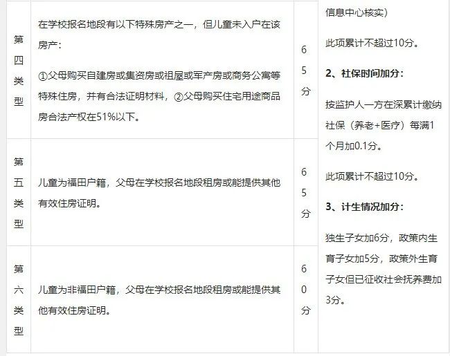 此外,"寶安戶籍,學(xué)區(qū)自購(gòu)商品房"、"深圳其他區(qū)戶籍,學(xué)區(qū)自購(gòu)商品房"、"寶安戶籍,無(wú)房租房"、"深圳其他區(qū)戶籍,無(wú)房租房"、"非深戶購(gòu)房"、"寶安戶籍,有房租房"等情況分別在原有基礎(chǔ)分上另加5分。
