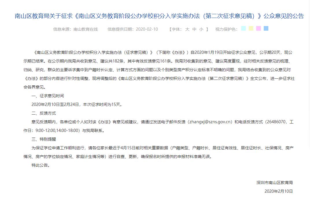 1月19日,南山區(qū)教育局第一次征求意見(jiàn)發(fā)出后,共收集到關(guān)于積分算法調(diào)整的反饋意見(jiàn)182條,并于2月10日第二次發(fā)布《南山區(qū)義務(wù)教育階段公布學(xué)校積分入學(xué)實(shí)施辦法》征求意見(jiàn)稿(以下簡(jiǎn)稱(chēng)《意見(jiàn)》),根據(jù)《意見(jiàn)》內(nèi)容,擬調(diào)整2020年積分入學(xué)辦法。