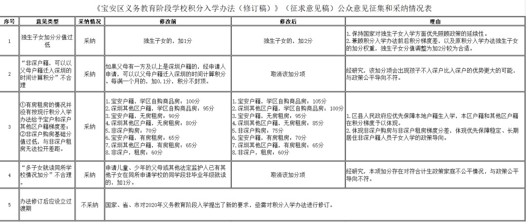 在新修訂稿中,寶安區(qū)教育局結(jié)合市民意見(jiàn)反饋,擬將獨(dú)生子女加分由1分調(diào)整至2分,并取消兩項(xiàng)加分項(xiàng),同時(shí)對(duì)部分情況分值進(jìn)行調(diào)整,以體現(xiàn)積分梯度。