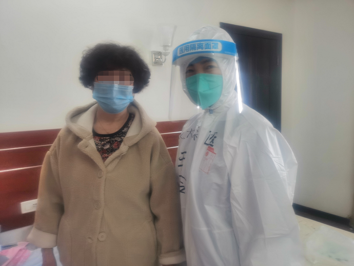 ▲深圳醫(yī)療隊(duì)員王玲與張金秀(化名)在隔離點(diǎn)合影。