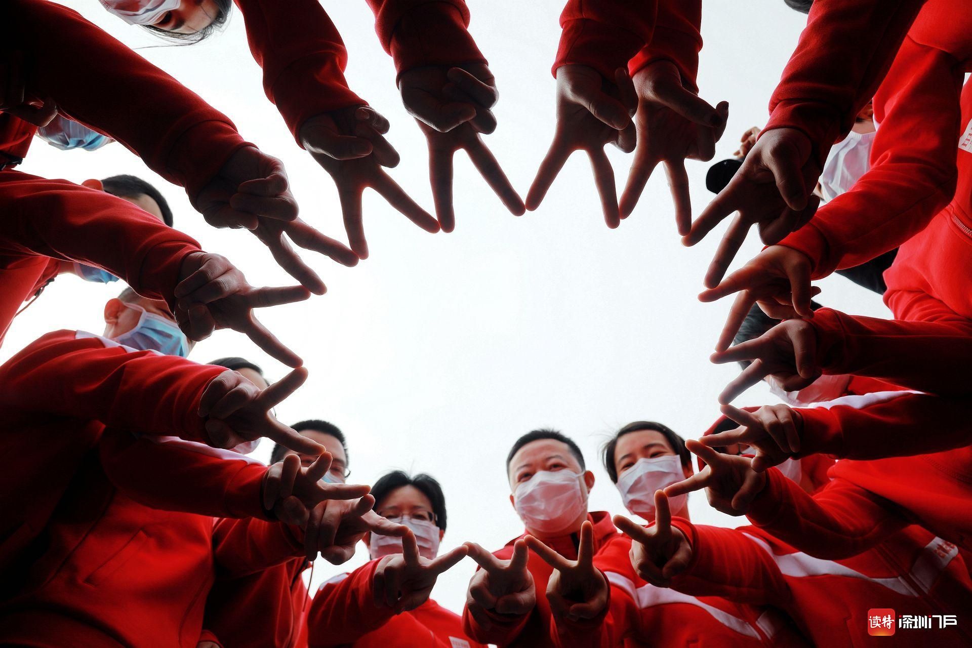 排好隊(duì)拍完照,幾位年輕的女護(hù)士靈機(jī)一動,每人伸出右手做出勝利的“V”形手勢,然后每個人手指挨著手指圍成了一個圓圈,讓記者拍照。這個造型立即激發(fā)了記者的創(chuàng)作欲望,于是記者直接躺在地上,準(zhǔn)備仰拍這個具有特殊意義的手勢造型。易黎隊(duì)長心領(lǐng)神會,馬上召集全隊(duì)參與進(jìn)來,用“V”形手指圍成了一個更大的圓圈。很快,一張記者用躺在地上的視角仰拍的作品誕生了,易黎給這張照片起了個標(biāo)題,叫《監(jiān)利?清零成功》。(特派荊州記者 李晶川)