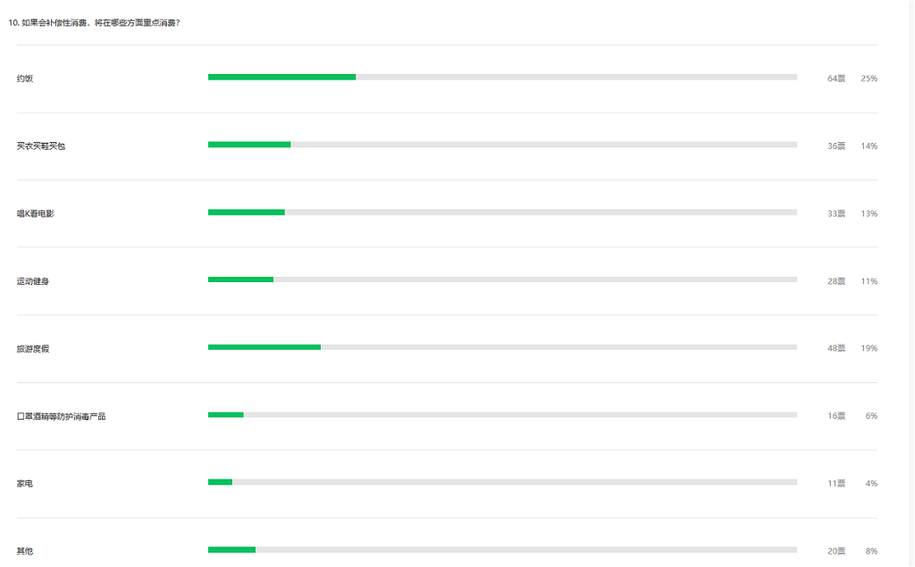 整體看,疫情對深圳市民總體消費(fèi)意愿有影響。調(diào)查顯示,近四成受訪者表示疫情結(jié)束后會(huì)有補(bǔ)償性消費(fèi),約飯、旅游度假、買衣買鞋買包、唱K看電影以及運(yùn)動(dòng)健身成為疫情過后補(bǔ)償性消費(fèi)的五大主要領(lǐng)域。