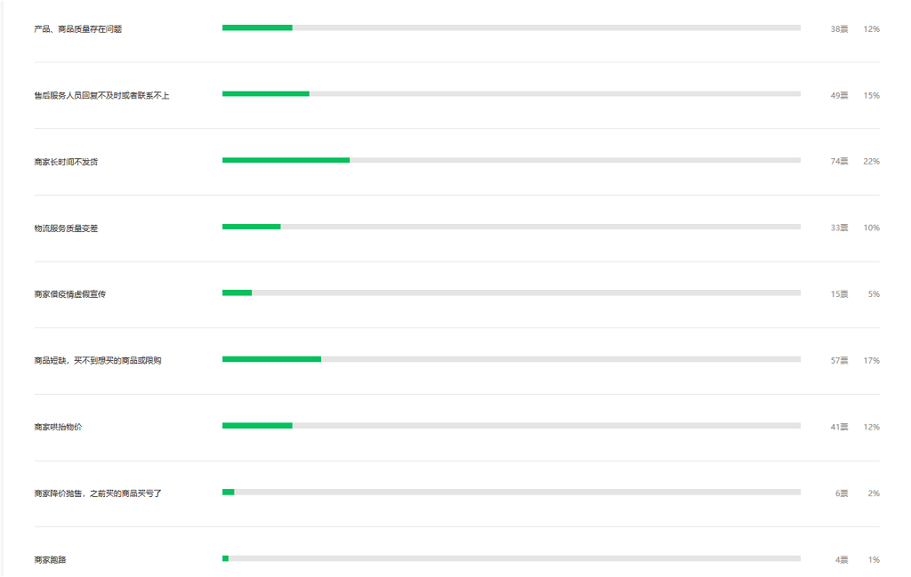 不少市民表示,疫情期間“在線消費(fèi)”遇到過問題。其中,長時(shí)間不發(fā)貨、因商品短缺或限購買不到商品、售后服務(wù)人員回復(fù)不及時(shí)或聯(lián)系不上位列市民消費(fèi)不滿意榜前三;而商品質(zhì)量存在問題、商家哄抬物價(jià)則并列消費(fèi)不滿意榜第四。