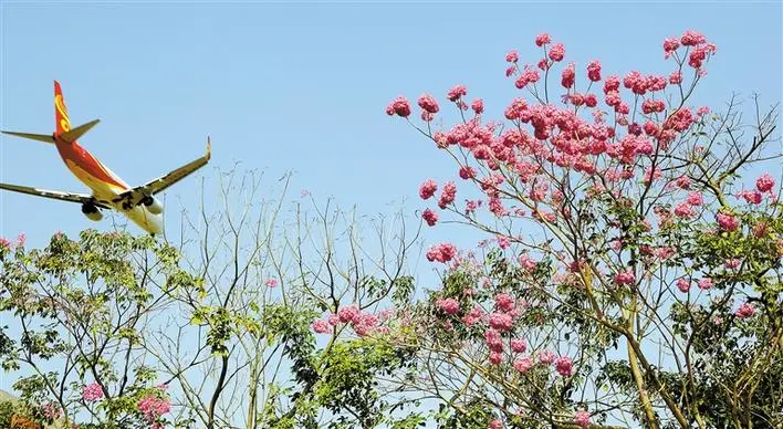 寶安航城街道機(jī)場(chǎng)南路兩旁,風(fēng)鈴木花綻放。