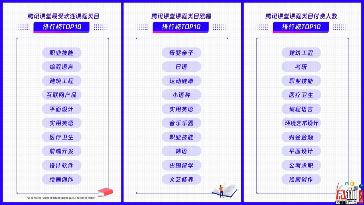 見圳客戶端·深圳新聞網(wǎng)2020年3月18日訊(見圳客戶端、深圳新聞網(wǎng)記者 劉夢婷)近日,在線職業(yè)教育平臺騰訊課堂發(fā)布數(shù)據(jù)報告:戰(zhàn)“疫”宅家期間,該平臺上課總時長提升3.5倍。同時,騰訊課堂還發(fā)布了最受歡迎課程類目(學習人數(shù))排行榜TOP10:職業(yè)技能、編程語言、建筑工程、互聯(lián)網(wǎng)產(chǎn)品、平面設計、實用英語、醫(yī)療衛(wèi)生、前端開發(fā)、設計軟件、繪畫創(chuàng)作。此外母嬰親子、日語、運動健康等課程學習人數(shù)同比漲幅均超過400%,成騰訊課堂增速最快類目,或成為未來在線職業(yè)教育新的增長點。IT互聯(lián)網(wǎng)就業(yè)類課程、工業(yè)產(chǎn)品設計類課程付費能力強,付費人數(shù)同比漲幅超過50%。