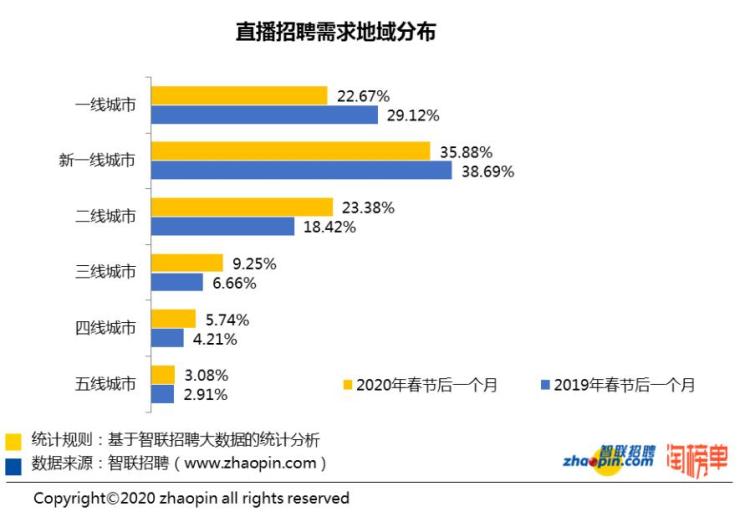 報(bào)告數(shù)據(jù)顯示,直播人才招聘需求主要集中在一線與新一線城市。今年春節(jié)后一個(gè)月,直播招聘職位數(shù)占比前5位依次為廣州、北京、杭州、深圳、成都。究其原因,一線城市的城市活力與人才流動(dòng)性本身較大,而以“網(wǎng)紅發(fā)源地”著稱的杭州以及“網(wǎng)紅打卡圣地”眾多的成都也借由濃厚互聯(lián)網(wǎng)氛圍在新一線城市中脫穎而出。