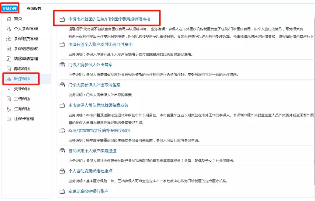 點擊“在線辦理”→點擊“醫(yī)療保險”→點擊“申請市外就醫(yī)的住院/門診費用報銷預(yù)審核”