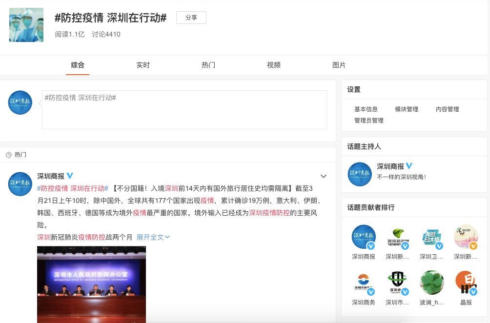 疫情發(fā)生初期,深圳商報微博創(chuàng)建話題 #防控疫情 深圳在行動# ,以高度的責(zé)任感和使命感全方位加強宣傳報道和輿論引導(dǎo),疫情相關(guān)信息均帶話題發(fā)布,人們可以系統(tǒng)地查看疫情相關(guān)信息。
