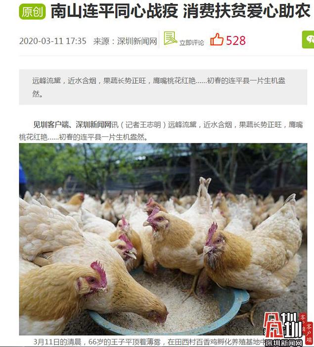 今年新冠肺炎疫情發(fā)生以后,南連農(nóng)業(yè)對(duì)口幫扶的河源連平四個(gè)基地受到影響,共有近2萬只百香雞待銷,其中連平縣田源鎮(zhèn)田西村基地的6000多只百香雞無人問津。就在村民一籌莫展的時(shí)候,深圳新聞網(wǎng)等媒體知曉后,迅速進(jìn)行深度采訪,3月11日刊發(fā)了《南山連平同心戰(zhàn)疫 消費(fèi)扶貧愛心助農(nóng)》的報(bào)道,呼吁深圳的企事業(yè)單位以及愛心市民,通過“以購(gòu)代捐”“以買代幫”的方式參與消費(fèi)扶貧,幫助連平農(nóng)戶們渡過難關(guān)。
