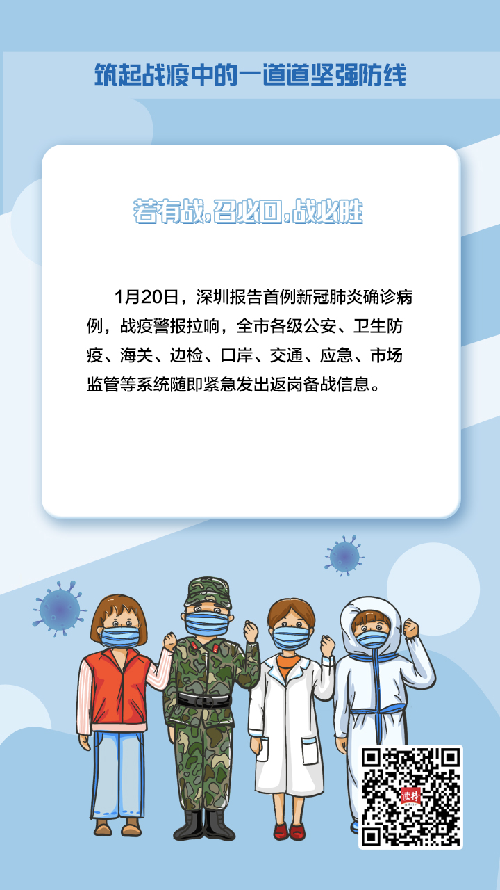 牢記習(xí)近平總書記的重要指示,深圳在新冠肺炎疫情防控的人民戰(zhàn)爭(zhēng)、總體戰(zhàn)阻擊戰(zhàn)中,鑄造了一支由不同“兵種”、精銳之師組成的守護(hù)者隊(duì)伍,堅(jiān)定地筑起一道堅(jiān)強(qiáng)屏障,守護(hù)好城市“外防輸入、內(nèi)防擴(kuò)散”的門戶。