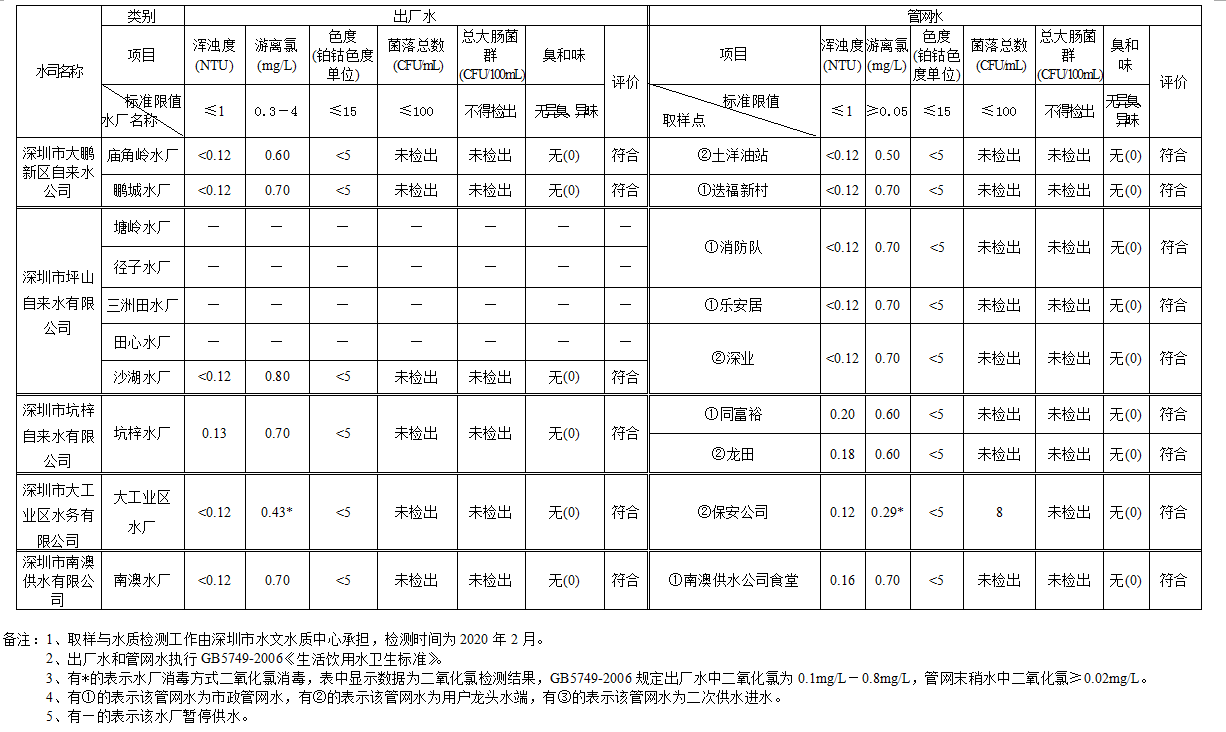 見圳客戶端·深圳新聞網(wǎng)2020年4月4日訊(見圳客戶端、深圳新聞網(wǎng)記者葉梅)2020年2月,深圳市水務(wù)局對(duì)全市42個(gè)水廠出廠水水樣以及68個(gè)管網(wǎng)水水樣進(jìn)行了抽檢。檢測(cè)結(jié)果表明,依據(jù)GB5749—2006《生活飲用水衛(wèi)生標(biāo)準(zhǔn)》,所有受檢42個(gè)出廠水水樣和68個(gè)管網(wǎng)水水樣的渾濁度、消毒劑(游離氯或二氧化氯或總氯)、色度、菌落總數(shù)、總大腸菌群及臭和味共6項(xiàng)常規(guī)指標(biāo)全部符合該標(biāo)準(zhǔn)的規(guī)定,出廠水水樣合格率為100%,管網(wǎng)水合格率為100%。