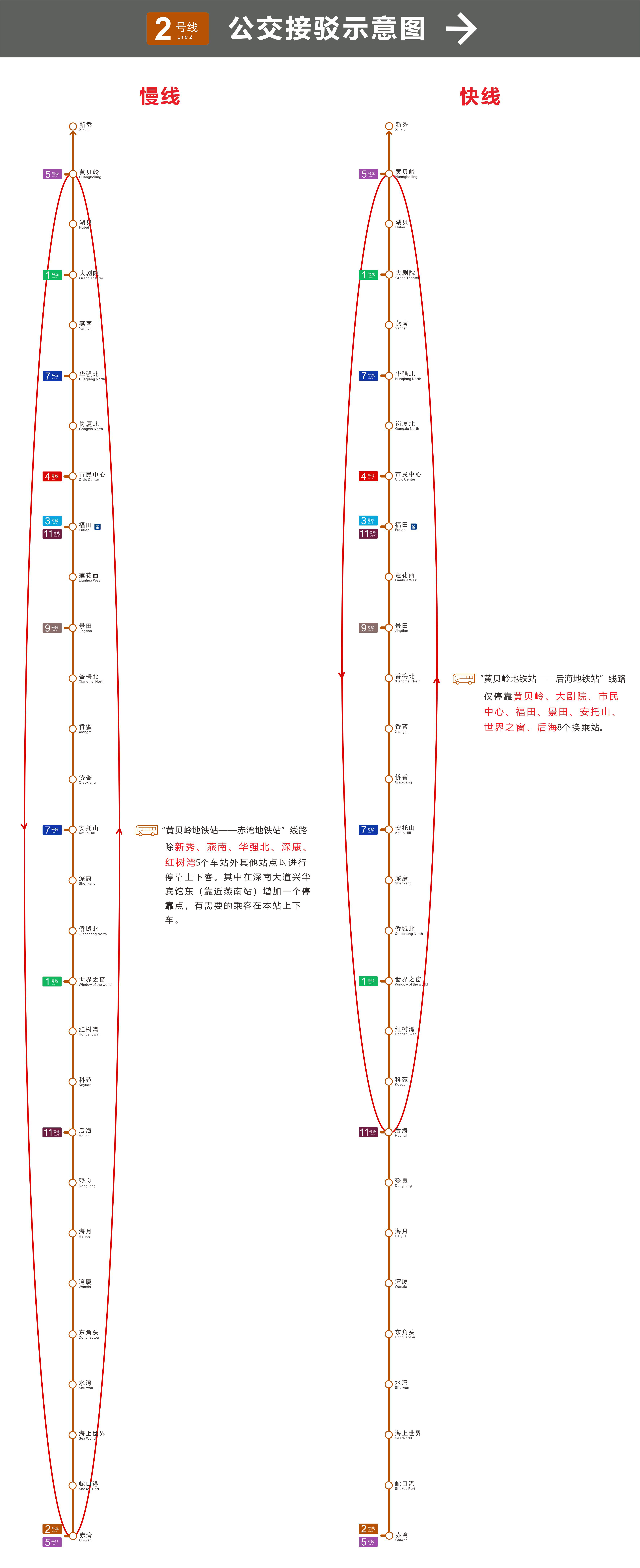 為了方便期間市民乘客的出行,屆時(shí)將組織循環(huán)開(kāi)行2號(hào)線的兩條公交接駁線路。1、公交接駁慢線:“黃貝嶺站—赤灣站”。除新秀、燕南、華強(qiáng)北、深康、紅樹(shù)灣5個(gè)站點(diǎn)不??恐?,其余各站均??可舷驴?。2、公交接駁快線:“黃貝嶺站—后海站”。僅停靠黃貝嶺、大劇院、市民中心、福田、景田、安托山、世界之窗、后海共8個(gè)換乘站。