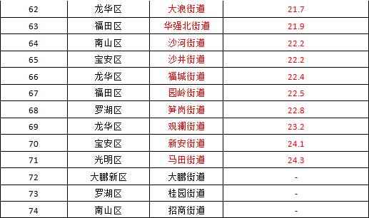 空氣質(zhì)量排名前十的街道是:桃源街道、黃貝街道、南灣街道、南湖街道、東湖街道、蓮塘街道、蛇口街道、福保街道、海山街道和東曉街道;空氣質(zhì)量排名倒數(shù)十位的街道是:馬田街道、新安街道、觀瀾街道、筍崗街道、園嶺街道、福城街道、沙井街道、沙河街道、華強(qiáng)北街道和大浪街道。