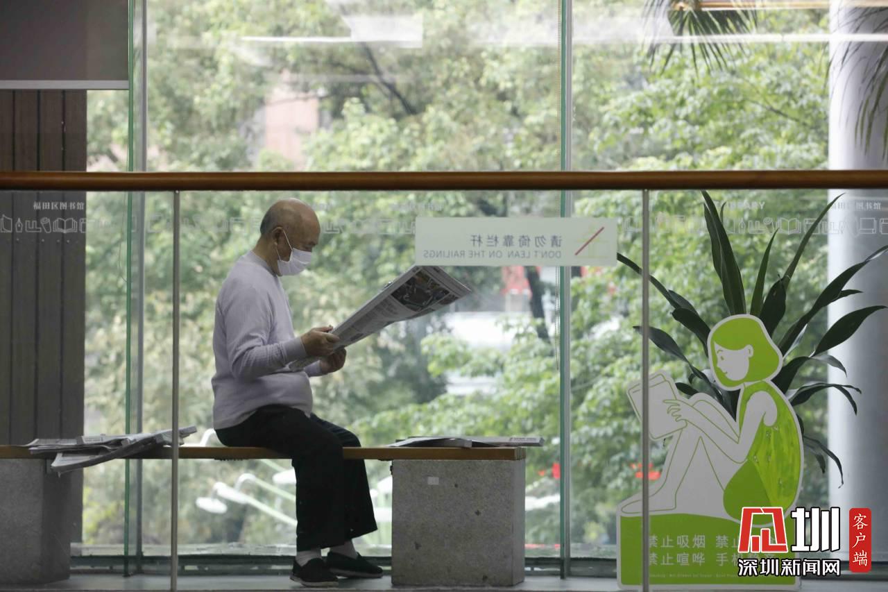 福田圖書館內(nèi),一位市民正在閱讀報(bào)紙。