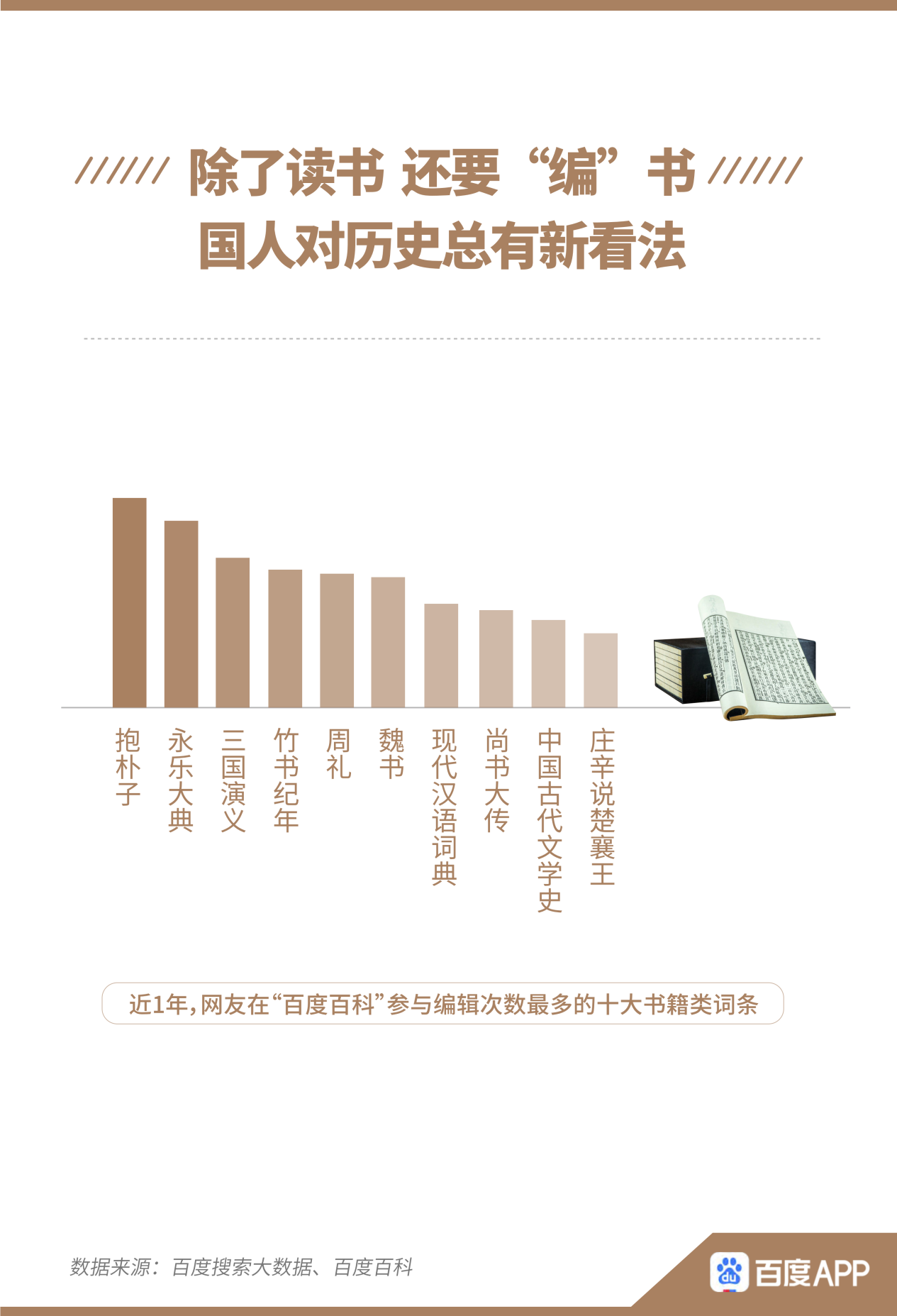 不僅讀書,這一屆網(wǎng)友還要“編”書。其中,網(wǎng)友對(duì)歷史著作總有新看法。報(bào)告顯示,近1年,網(wǎng)友在百度百科參與編輯次數(shù)最多的十大書籍類詞條,歷史著作占7席。《永樂大典》在600年后仍舊“編輯”不停。