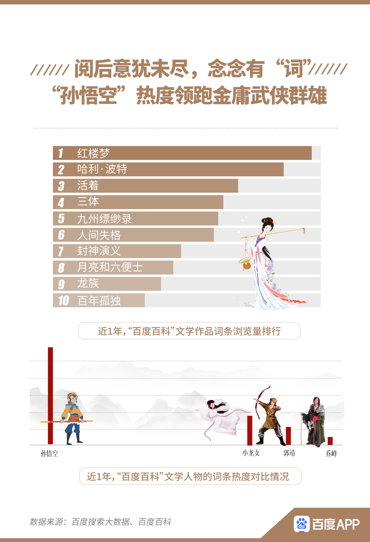 而百度百科的數(shù)據(jù)表明,人們?cè)陂喿x經(jīng)典書籍后,點(diǎn)擊詞條查看更多背景、釋義也是常態(tài)。《紅樓夢(mèng)》、《哈利·波特》、《活著》、《三體》是近1年來網(wǎng)友在百度百科瀏覽較多的文學(xué)作品相關(guān)詞條。