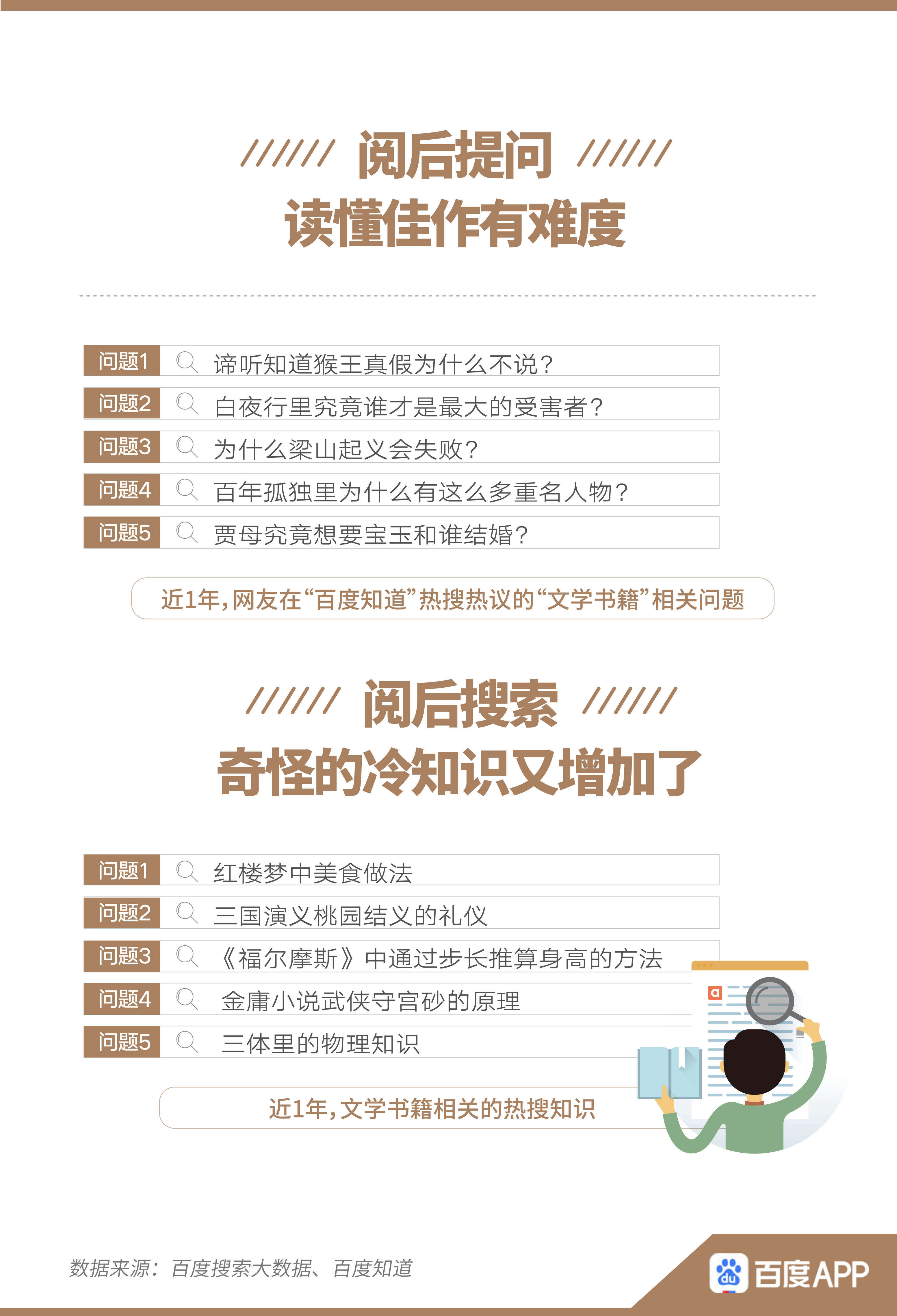 閱后提出對(duì)書籍的疑惑、討論思考、參與表達(dá),均是讀者的重要需求。報(bào)告顯示,近1年,不少網(wǎng)友在閱讀之后,選擇到百度知道提問、討論。例如,“諦聽知道猴王真假為什么不說”、“白夜行究竟誰是最大受害者”等情節(jié)相關(guān)問題,均引起網(wǎng)友的熱搜熱議。除此之外,在百度搜索與主要情節(jié)無關(guān)的“冷”知識(shí)的人也不在少數(shù),如“紅樓夢(mèng)中美食做法”、“三體里的物理知識(shí)”等。