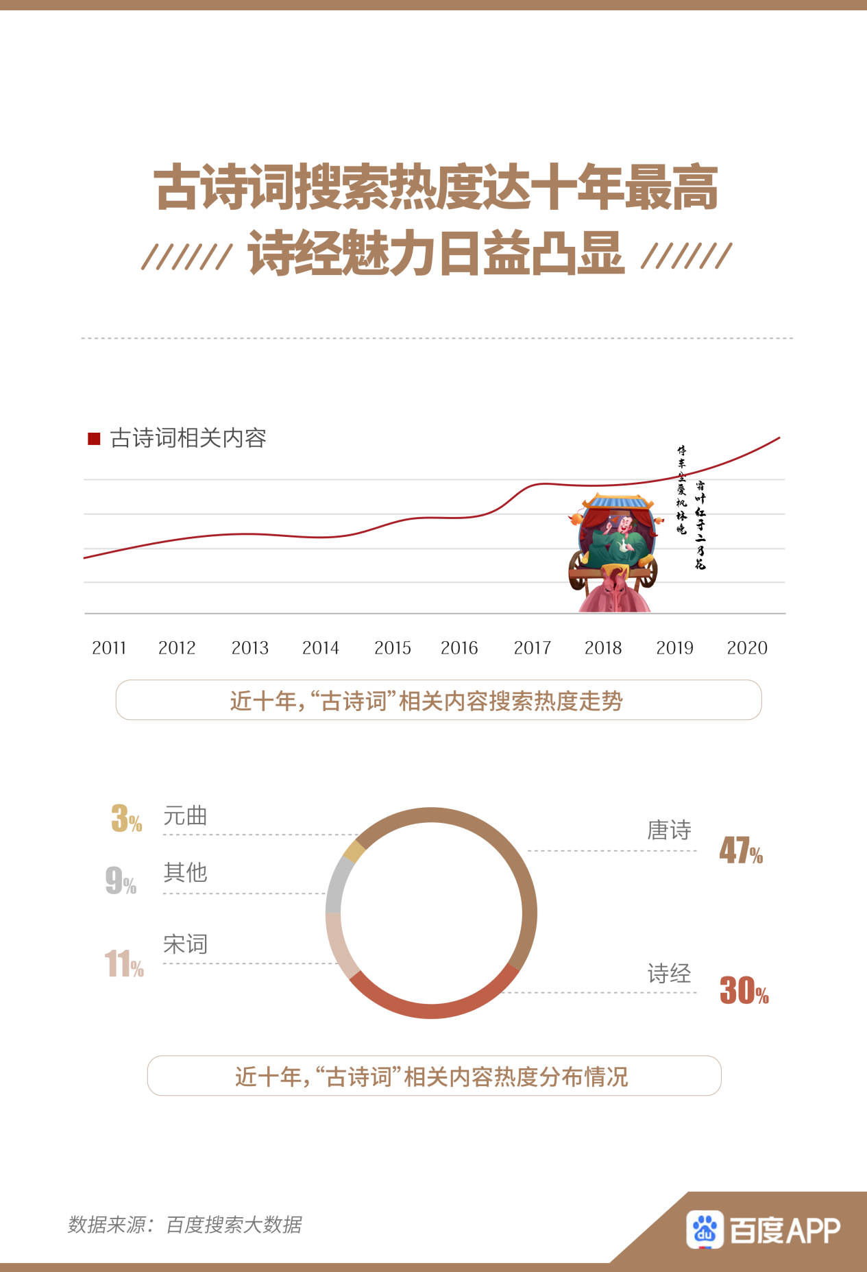 事實(shí)上,“四大名著”熱度年勝一年的背后,是人們對(duì)傳統(tǒng)文化的熱愛日益提升。這也反映在古詩(shī)詞的搜索熱度之上。報(bào)告顯示,古詩(shī)詞搜索熱度逐年攀升,在2020年達(dá)十年最高。詩(shī)經(jīng)越來越多地出現(xiàn)在人們視野之中,搜索熱度占比30%。