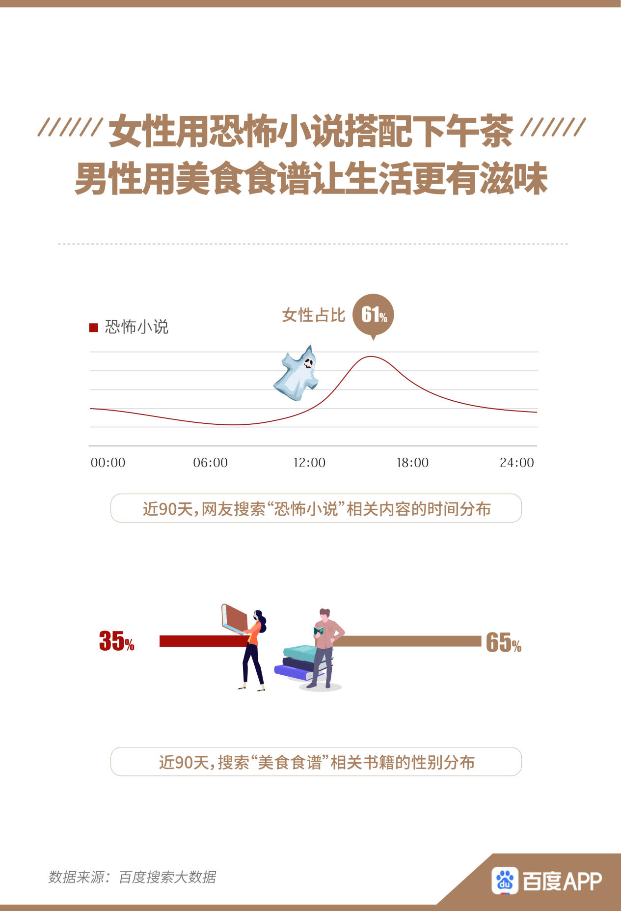 與往常印象相反,搜索“恐怖小說”相關(guān)內(nèi)容的人群中,女性比男性更多,占比61%,下午15時(shí)是搜索的高峰時(shí)間。而男性更關(guān)注“美食食譜”相關(guān)書籍,在搜索相關(guān)書籍的人群中占比65%。