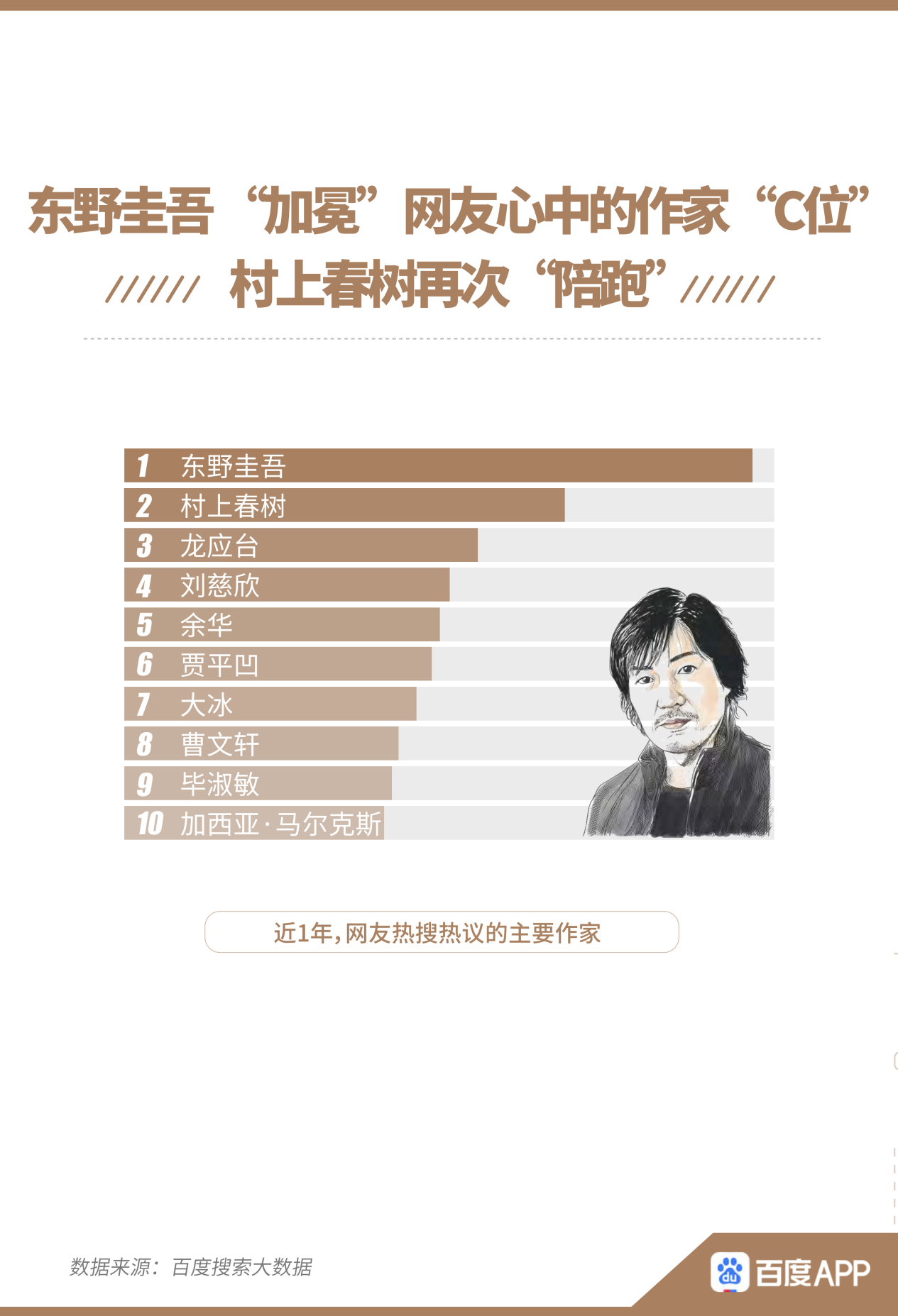 經(jīng)典深入人心,也無礙閱讀世界百家爭(zhēng)鳴。報(bào)告盤點(diǎn)了近1年網(wǎng)友熱搜熱議的主要作家,推理小說家東野圭吾占熱度C位,村上春樹位居第二,再“陪跑”。