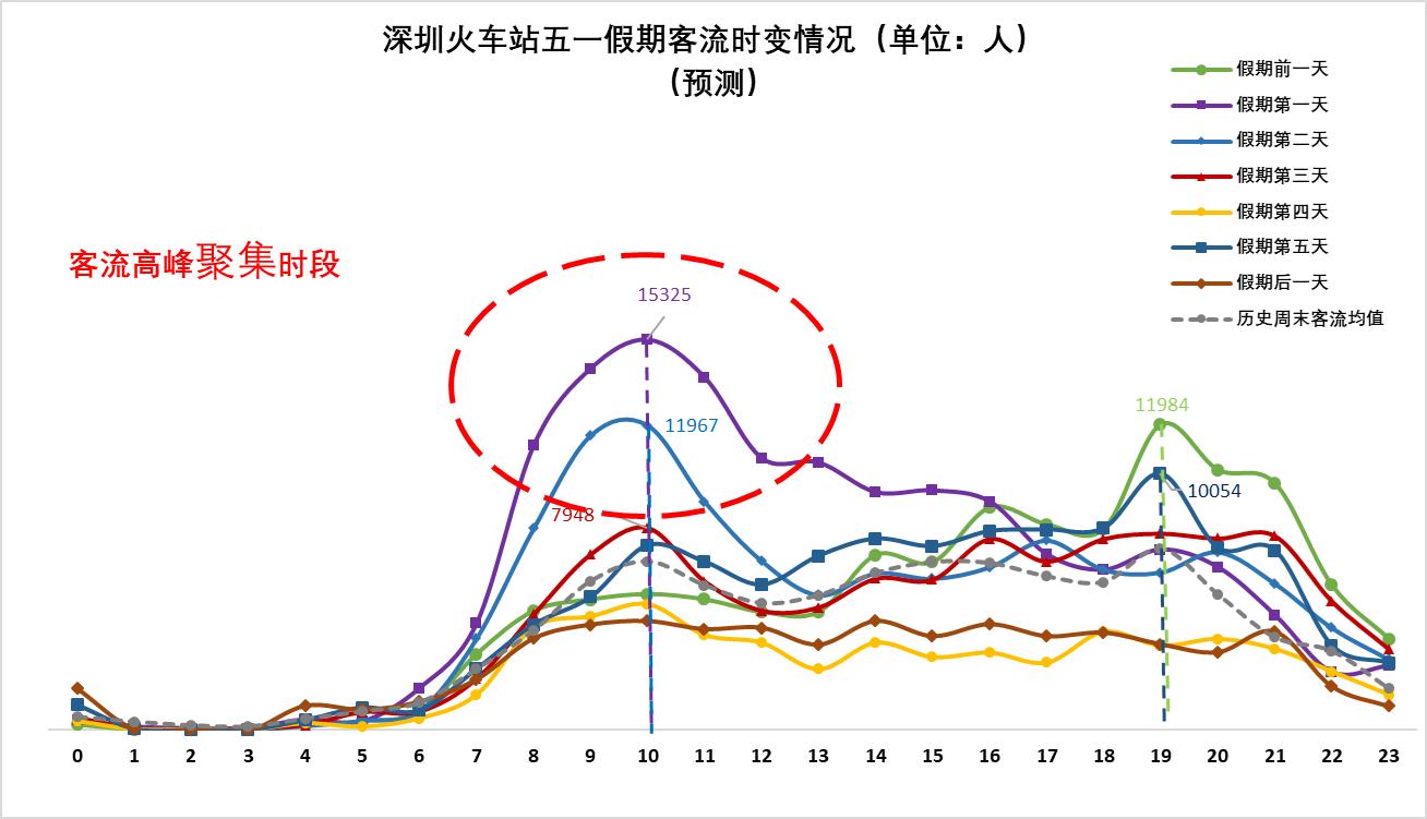 ▲預(yù)計深圳火車站5月1日(假期第一天)、5月2日(假期第二天)的上午時段較易出現(xiàn)當(dāng)日客流高峰;4月30日(假期前一天)、5月5日(假期第五天)的晚間時段較易出現(xiàn)當(dāng)日客流高峰。