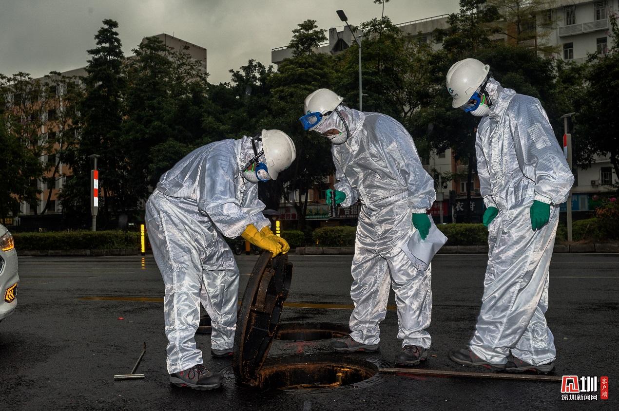 福田分公司巡查工張憶浩、吳暉雄和羅寶斌,正對福中路的排水管網(wǎng)進(jìn)行細(xì)致排查。身后的烏云,與他們白色的防護(hù)服形成鮮明對比。