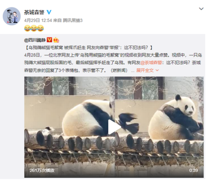 5月6日,有網(wǎng)友爆料,北京動物園有烏鴉在熊貓身后薅屁股毛。