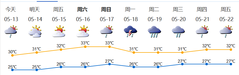 我市陰天間多云,有分散陣雨;氣溫25-30℃;東風(fēng)2-3級;相對濕度65%-95%。