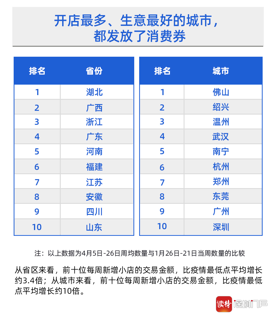 值得注意的是,排名前十的省份及城市,絕大多數(shù)都通過支付寶發(fā)放了消費(fèi)券。4月份以來,佛山、珠海、東莞、清遠(yuǎn)、深圳羅湖和龍崗區(qū)陸續(xù)通過支付寶等平臺(tái)發(fā)放消費(fèi)券,廣東發(fā)放消費(fèi)券總額已經(jīng)超過10億元,成為全國發(fā)放消費(fèi)券最多的省份之一。尤其是上述排名第一的佛山,在市區(qū)兩級消費(fèi)券刺激下,線下餐飲、美容美發(fā)等行業(yè)迎來一波消費(fèi)熱潮。阿里本地生活數(shù)據(jù)顯示,自佛山消費(fèi)券發(fā)布后,佛山線下餐飲門店新開業(yè)環(huán)比增幅超過35%,餐飲類消費(fèi)訂單量環(huán)比增幅也超過了152%,美容美發(fā)訂單增長了350%以上。