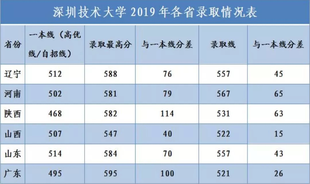 2019年,深圳技術(shù)大學(xué)首次獨(dú)立招生,面向遼寧、河南、陜西、山西、山東和廣東六省,共錄取807名新生。六省份均一次性滿額投檔,高于一本線(高優(yōu)線/自招線)錄取。其中河南、陜西高于一本線60分,遼寧、山東高于一本線40分。廣東錄取分?jǐn)?shù)線為521分,高于理科優(yōu)先投檔分?jǐn)?shù)線26分,列廣東高校理科第九,錄取最高分為595分。