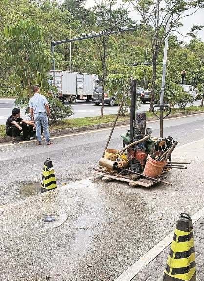 2020年5月1日,執(zhí)法支隊龍崗大隊執(zhí)法人員在轄區(qū)內(nèi)值班巡查時,接到投訴稱愛南路上海外國語學校門口有道路施工人員鉆探時鉆破水管,現(xiàn)場水流滿地,請求執(zhí)法人員前往調(diào)查。