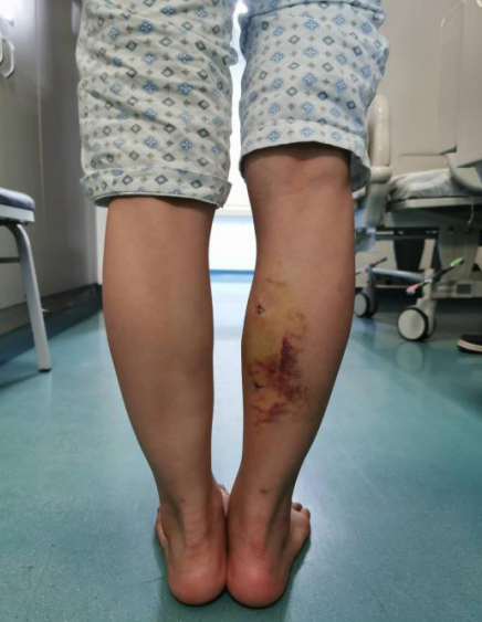 20歲出頭的楊柳(化名)右小腿注射肉毒素后發(fā)生肌肉攣縮,導(dǎo)致右足跟不能著地,雙下肢不等長,跛行。