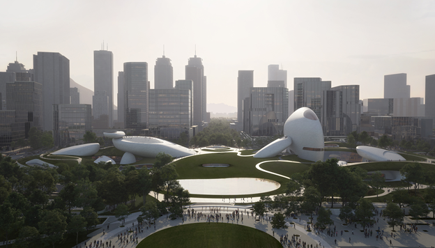 該項(xiàng)目由著名建筑師馬巖松帶領(lǐng)的MAD建筑事務(wù)所負(fù)責(zé)項(xiàng)目方案設(shè)計(jì)。方案顯示,將以“遠(yuǎn)古”和“未來”兩大概念,通過步道串聯(lián)起散落石群建筑、綠地、公共活動區(qū),展現(xiàn)原始氛圍與未來力量的結(jié)合。在南館與北館兩個展館中間設(shè)有架空中軸景觀連橋,其中超高層的石群展廳將打造出炫目的展覽效果。此外,廣場還將連接深圳人才公園,形成一片連續(xù)的開放空間。