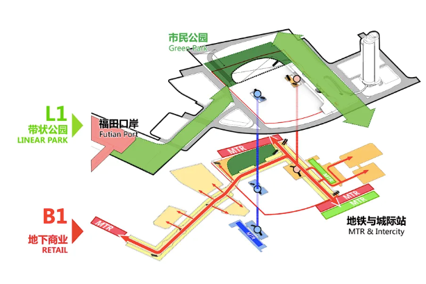 地下一層——軌道換乘:通過(guò)“城市通廊”實(shí)現(xiàn)周邊多條軌道站點(diǎn)的高效換乘,并實(shí)現(xiàn)新舊口岸、軌道交通及城市綠軸的高度復(fù)合。
