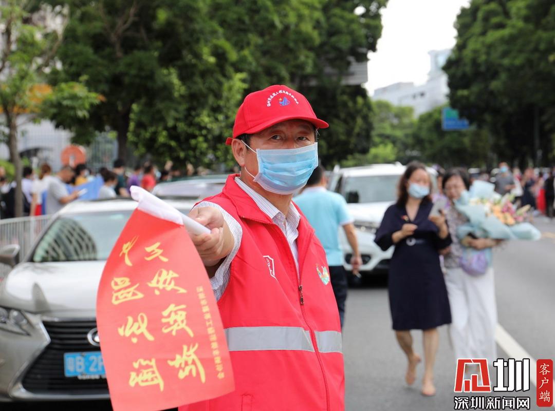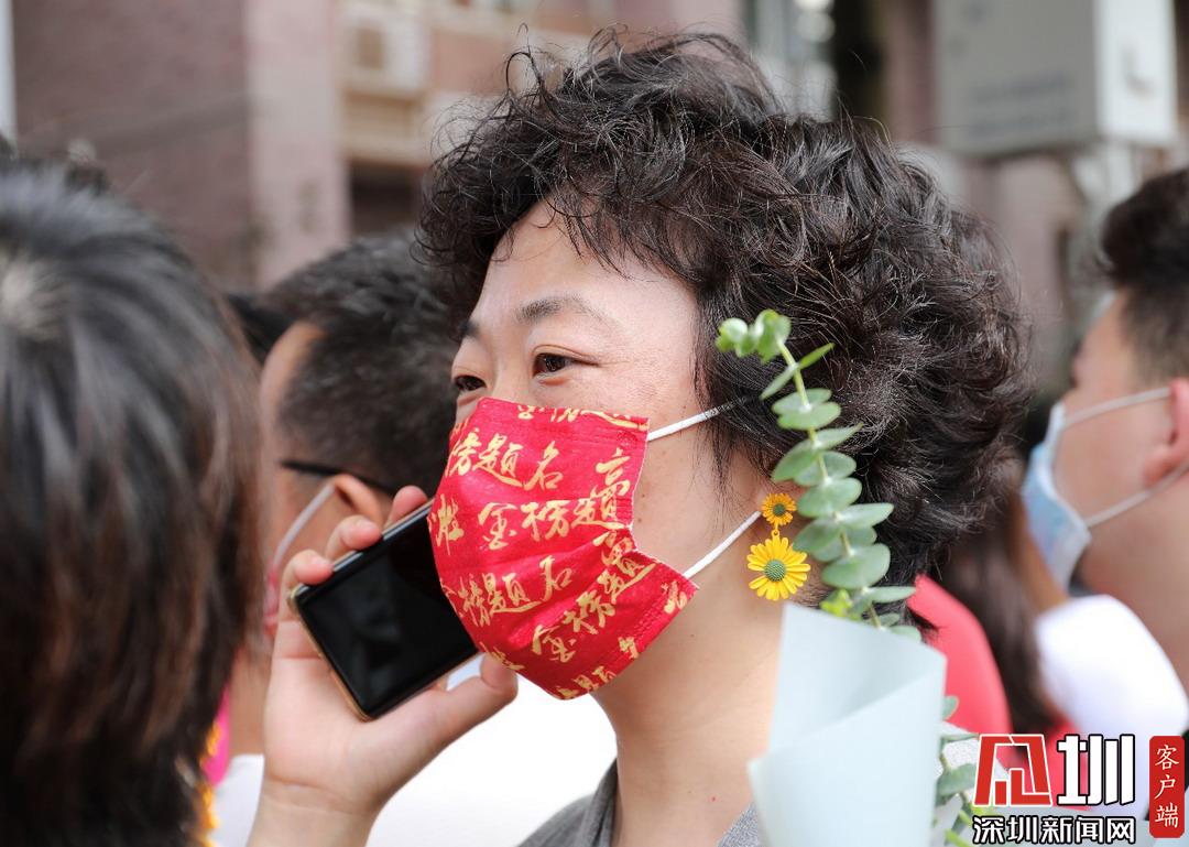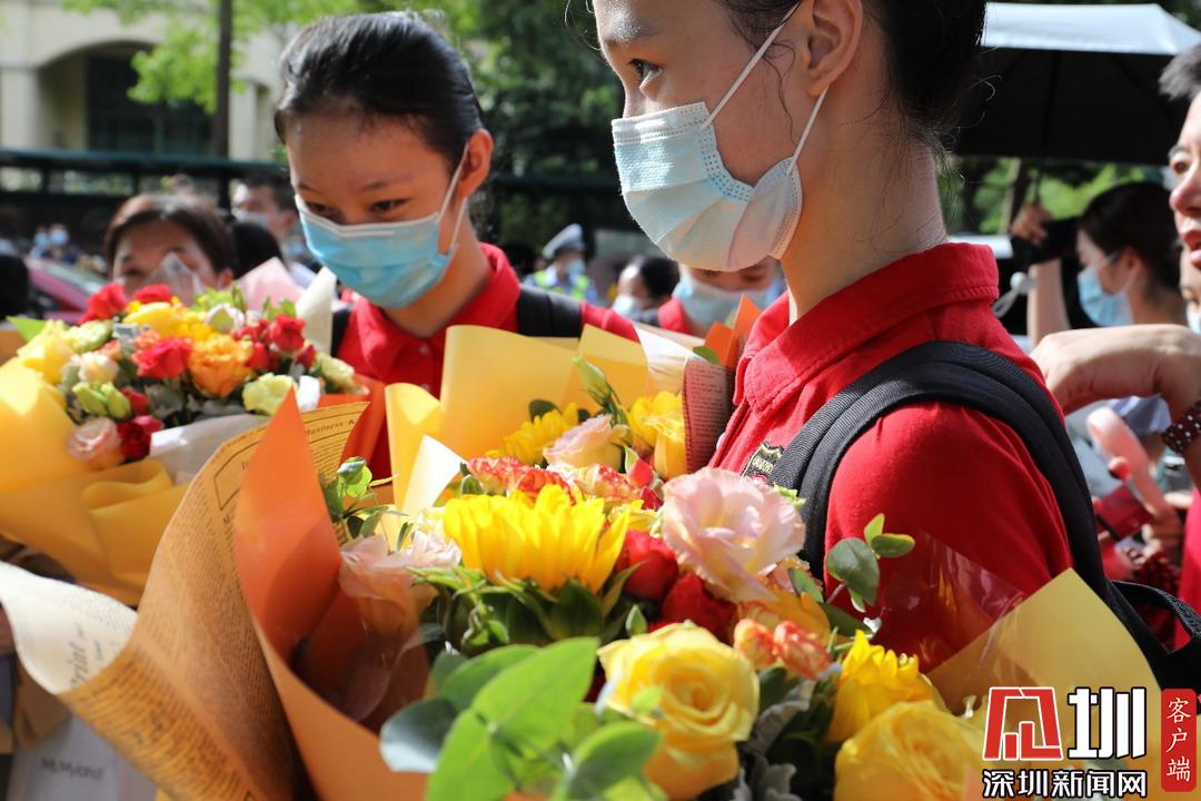 深圳高級中學(xué)考點(diǎn)外家長受捧鮮花、滿懷期待。