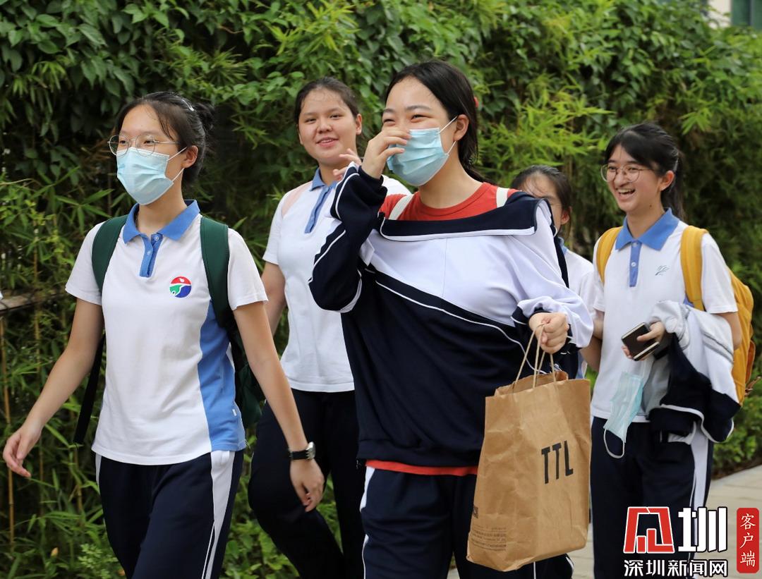 深圳高級中學(xué)考點(diǎn)外考生腳步輕盈走出考場,有說有笑。