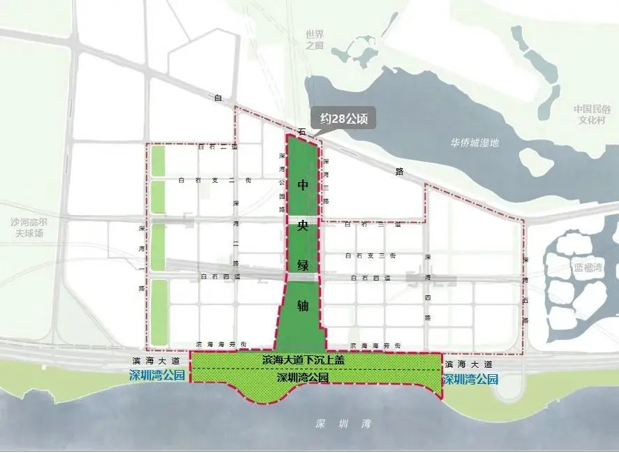 今年6月6日上午,該基地舉行中央綠軸項(xiàng)目開工活動(dòng),此次開工的中央綠軸項(xiàng)目南北全長(zhǎng)約1.0公里,最大寬度達(dá)210米,是連接塘朗山——華僑城濕地——深圳灣“通山達(dá)海”的核心空間軸線。隨著濱海大道深超總段下沉工程建設(shè),未來(lái)深超總紅線內(nèi)景觀將與深圳灣公園無(wú)縫銜接,共同構(gòu)成南北貫通的中央綠軸體系。