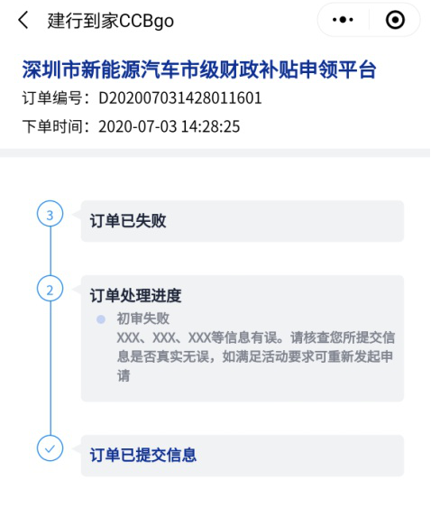 如客戶初審、終審失敗,重新進(jìn)入“深圳市新能源汽車市級(jí)財(cái)政補(bǔ)貼申領(lǐng)平臺(tái)”發(fā)起申請(qǐng)即可。
