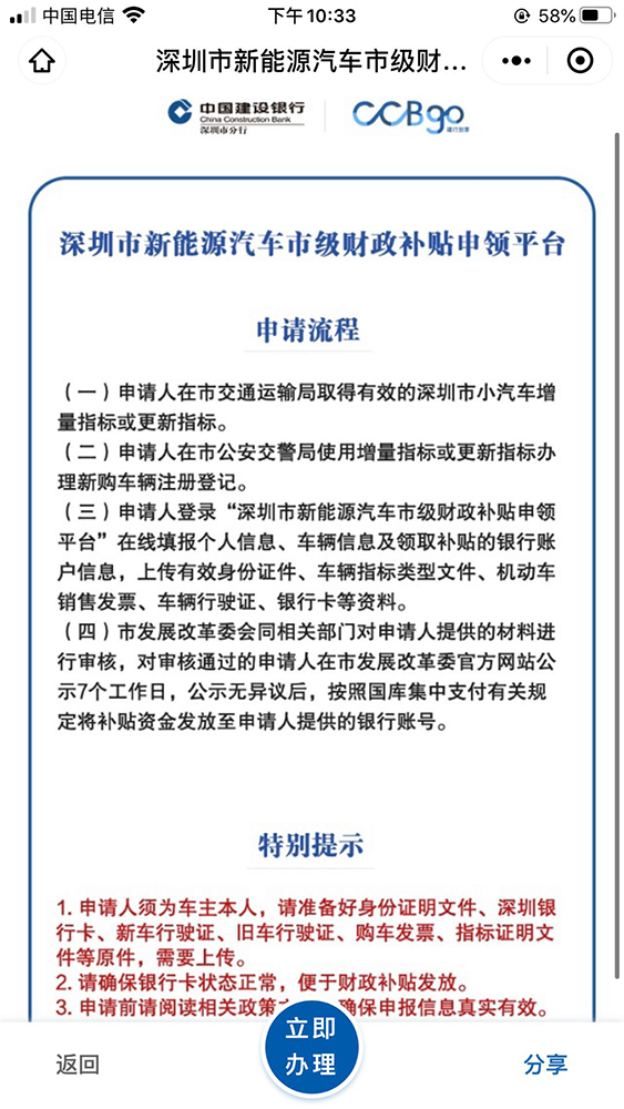 客戶可通過i深圳微信公眾號(hào)、深圳市發(fā)展和改革委員會(huì)官方網(wǎng)站或微信公眾號(hào)、深圳交警微信公眾號(hào)或建行到家CCBgo小程序登錄“深圳市新能源汽車市級(jí)財(cái)政補(bǔ)貼申領(lǐng)”平臺(tái)。
