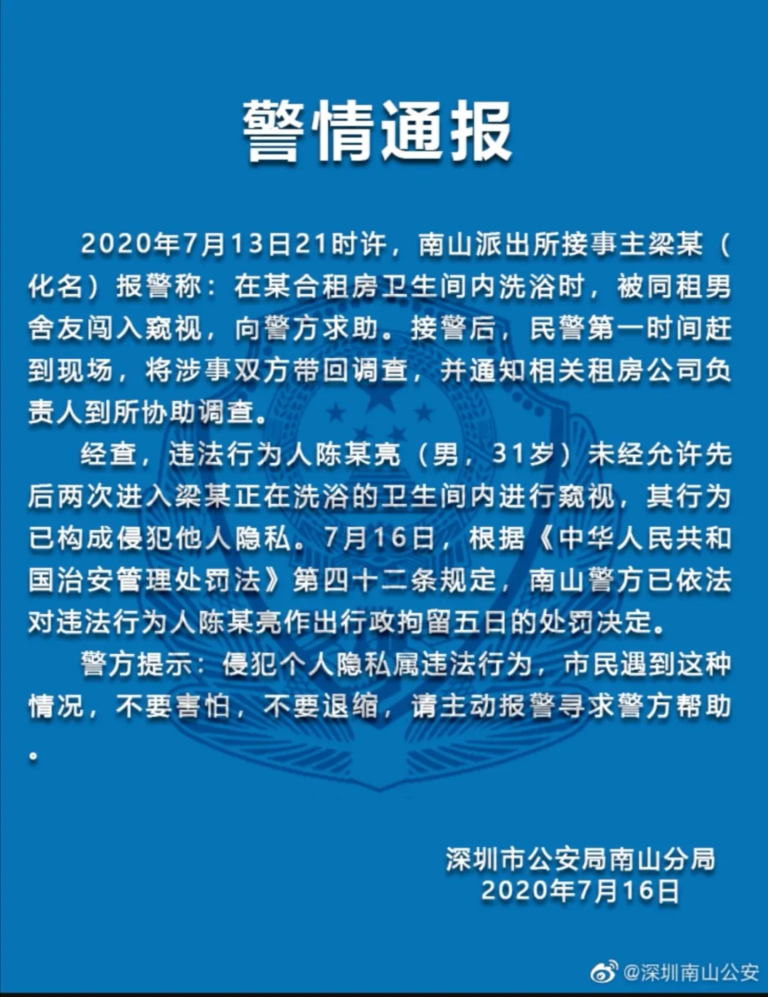 蛇口消息報(bào)2020年7月16日訊 7月16日,南山警方發(fā)布對(duì)“女生合租房衛(wèi)生間洗浴被同租男舍友闖入”事件的警情通報(bào),違法行為人陳某亮(男,31歲)行為已構(gòu)成侵犯他人隱私,南山警方已依法對(duì)陳某亮作出行政拘留5日的處罰決定。