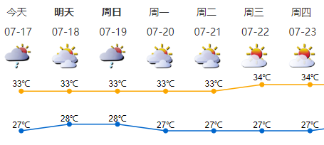 我市多云,局部有短時(雷)陣雨;氣溫27-33℃,中北部地區(qū)最高氣溫34-35℃;南風(fēng)3-4級,陣風(fēng)6級;相對濕度60%-95%。